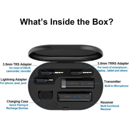With an in-built omnidirectional microphone on the transmitter, it is easy to use. After pairing, just connect the receiver with your recording device, pin the transmitter on your collar to get started.ย The BOYA BY-WM3D 2.4GHz wireless microphone system features one transmitter and one receiver, both of them are compact and lightweight.